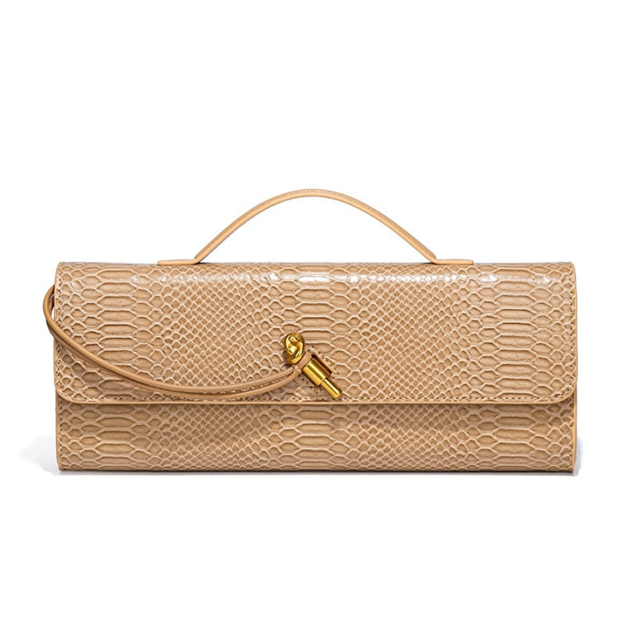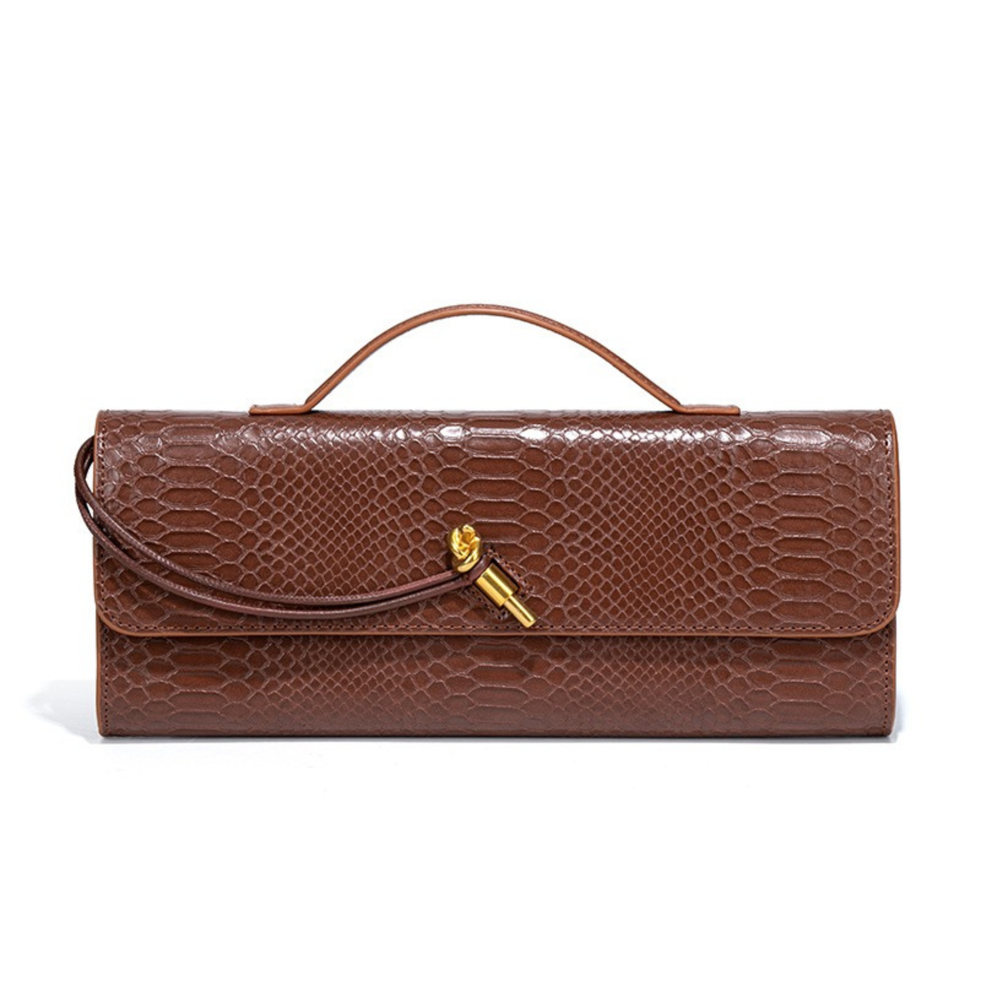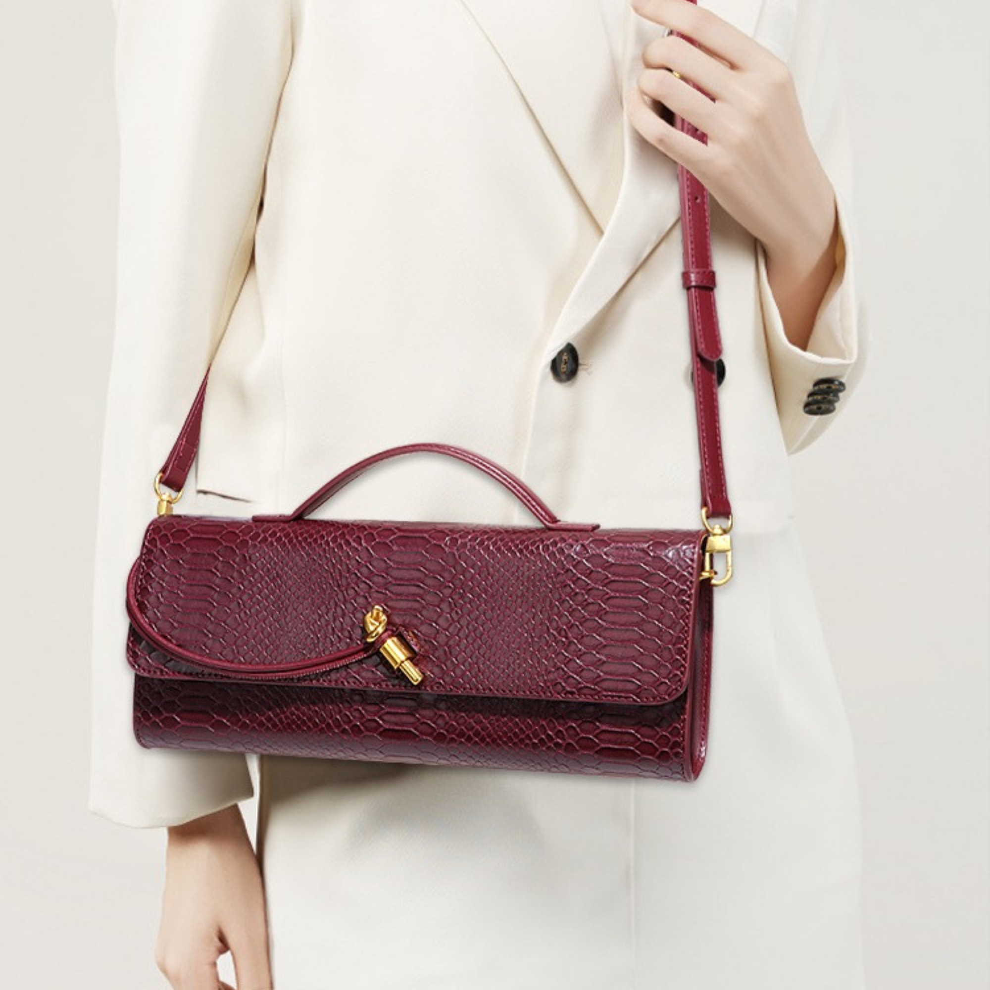 Elevate your style with this handcrafted leather clutch, featuring a timeless crocodile leather pattern and luxurious gold twist lock. Designed with versatility in mind, it can be carried as a chic handbag or worn crossbody for effortless sophistication. Perfect for evening outings, weddings, or any occasion where elegance meets practicality. The rich texture and refined craftsmanship make it a lasting statement piece in your collection.