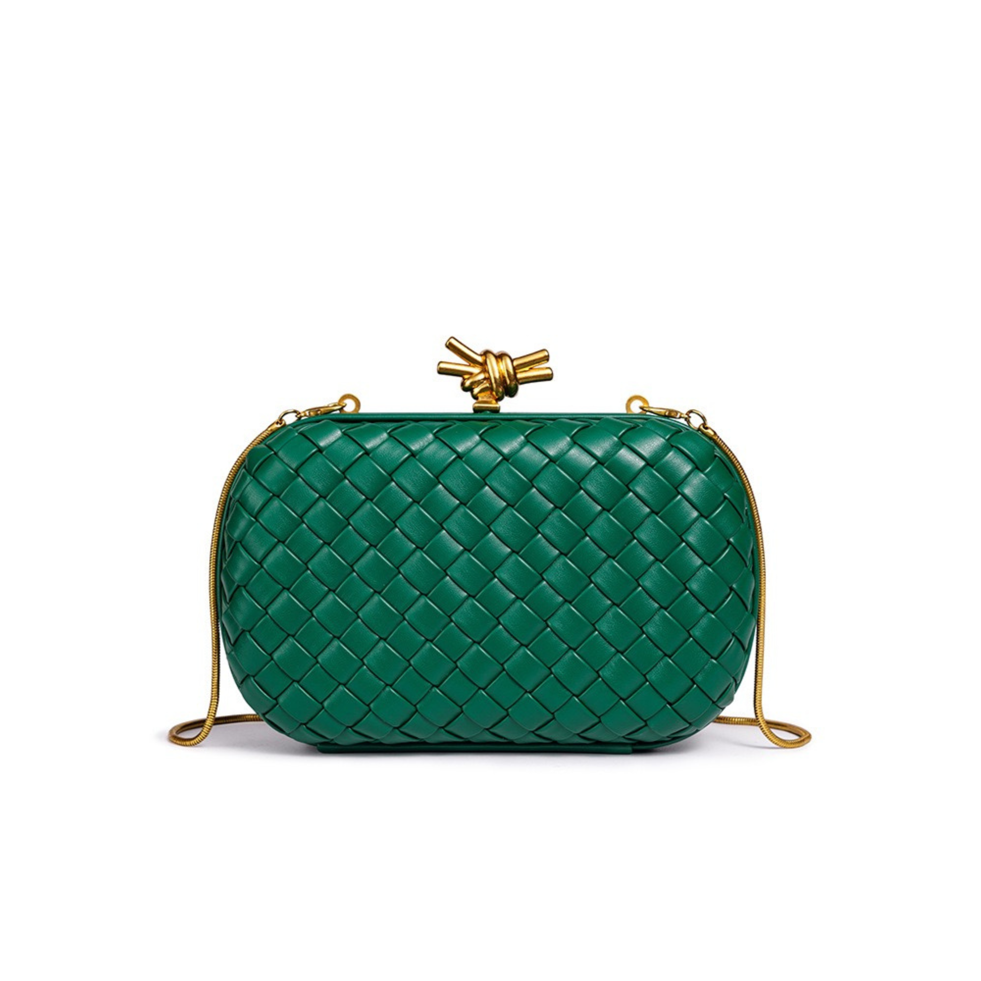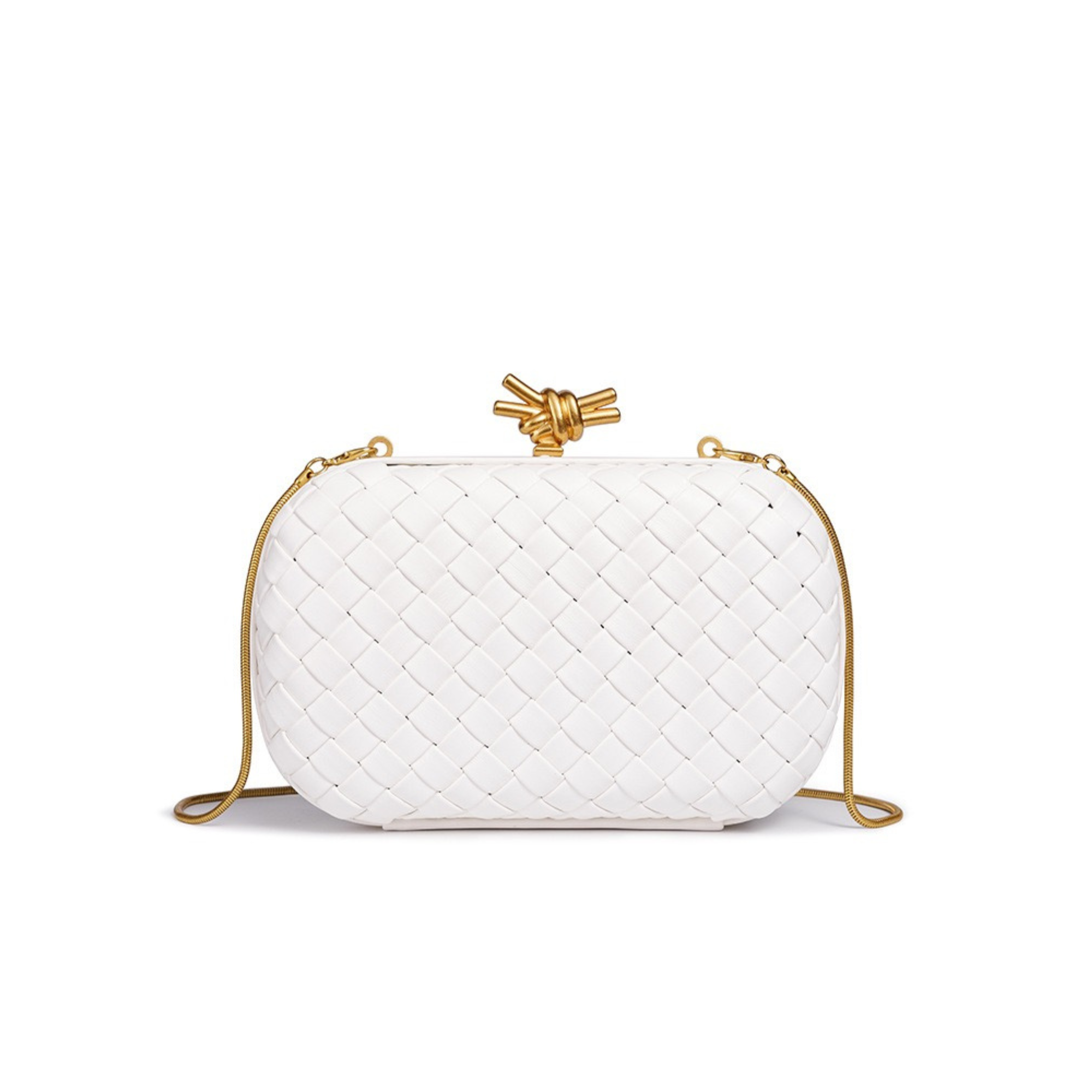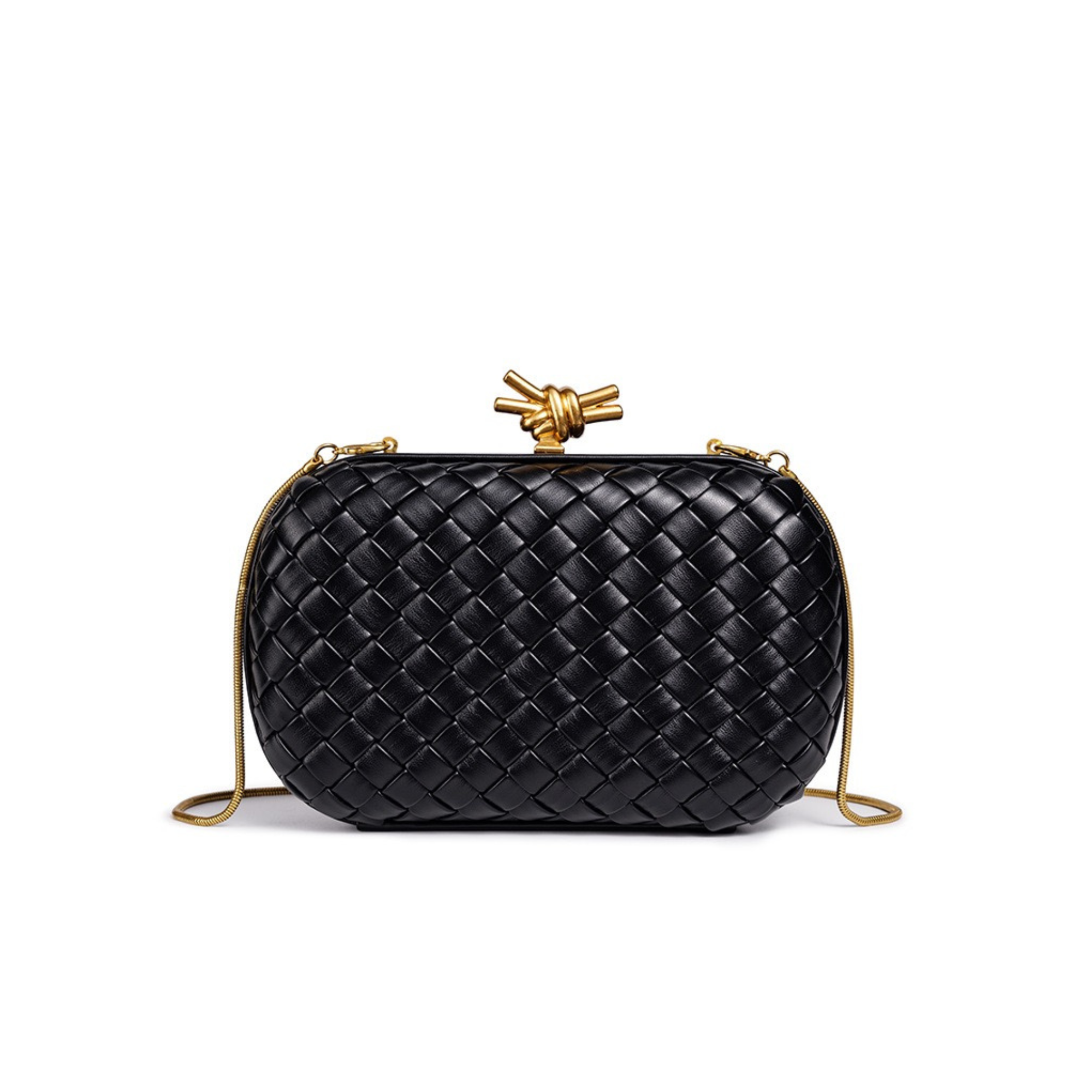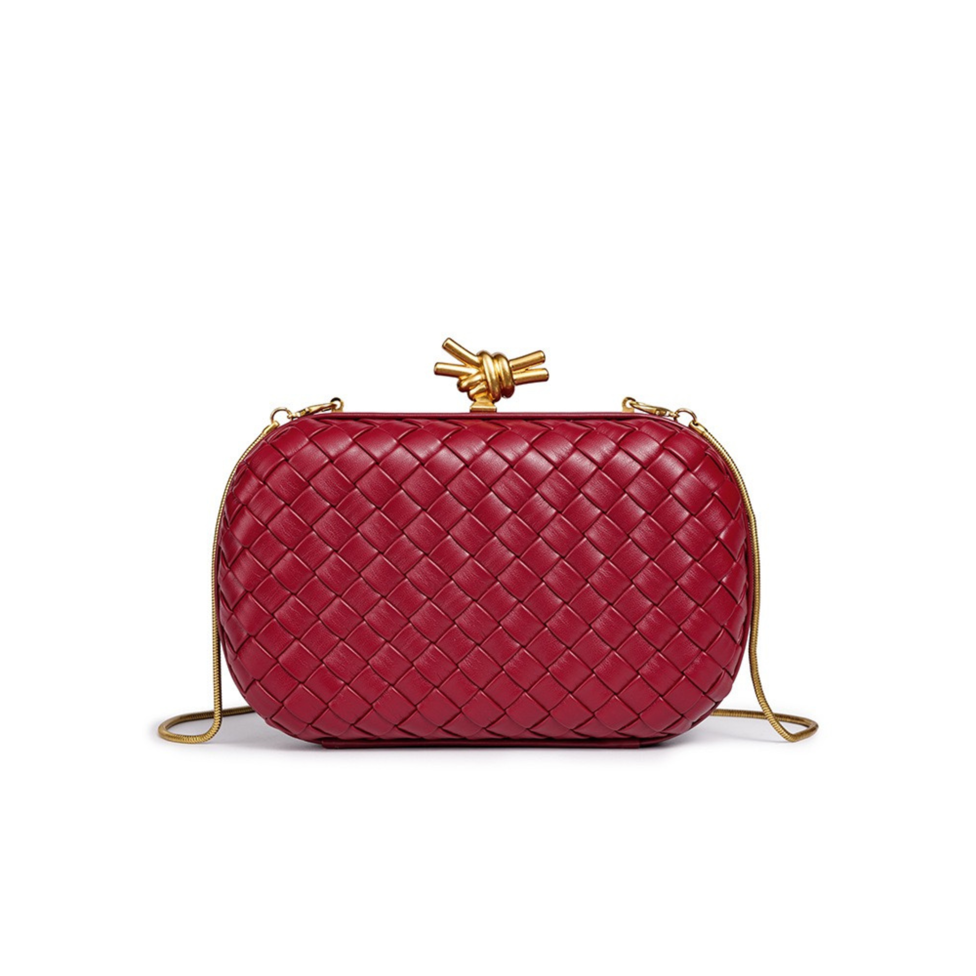 This woven leather clutch is a modern statement of elegance and style. Handcrafted with a sleek texture and finished with a gold knot clasp, it combines contemporary design with a touch of glamour. The structured oval shape opens to a smooth, lined interior that fits your phone, cards, and other small essentials. A detachable gold chain strap allows you to wear it as a clutch or crossbody, making it perfect for evening events, parties, or formal occasions.