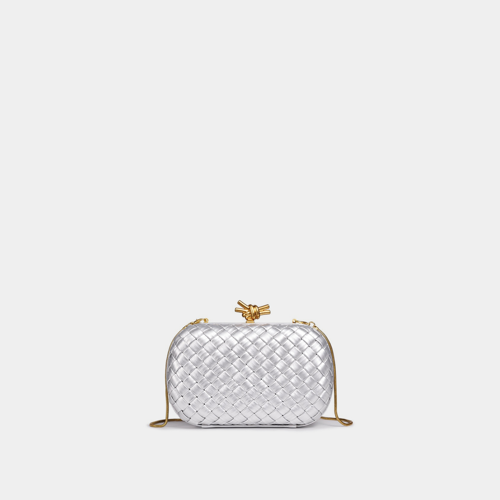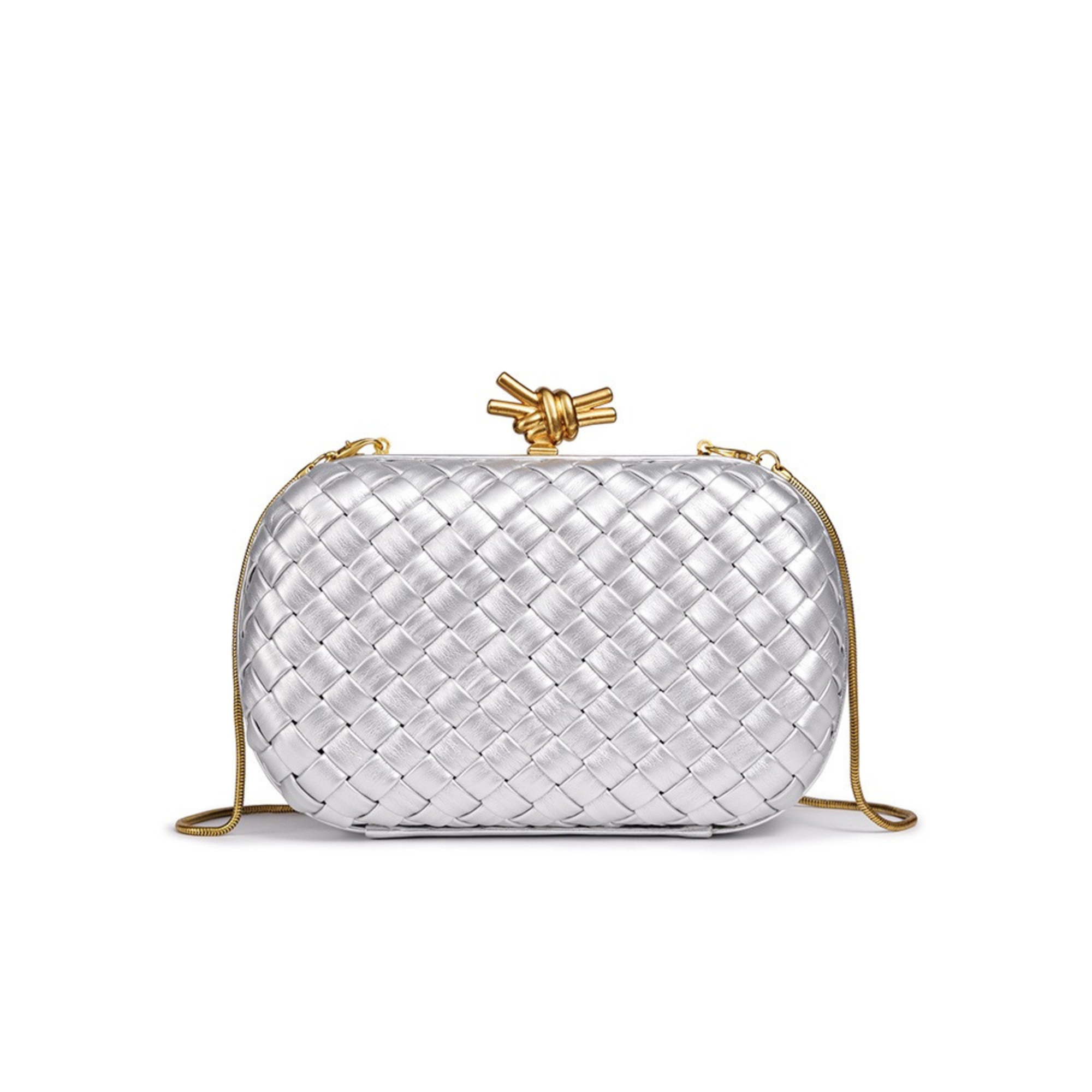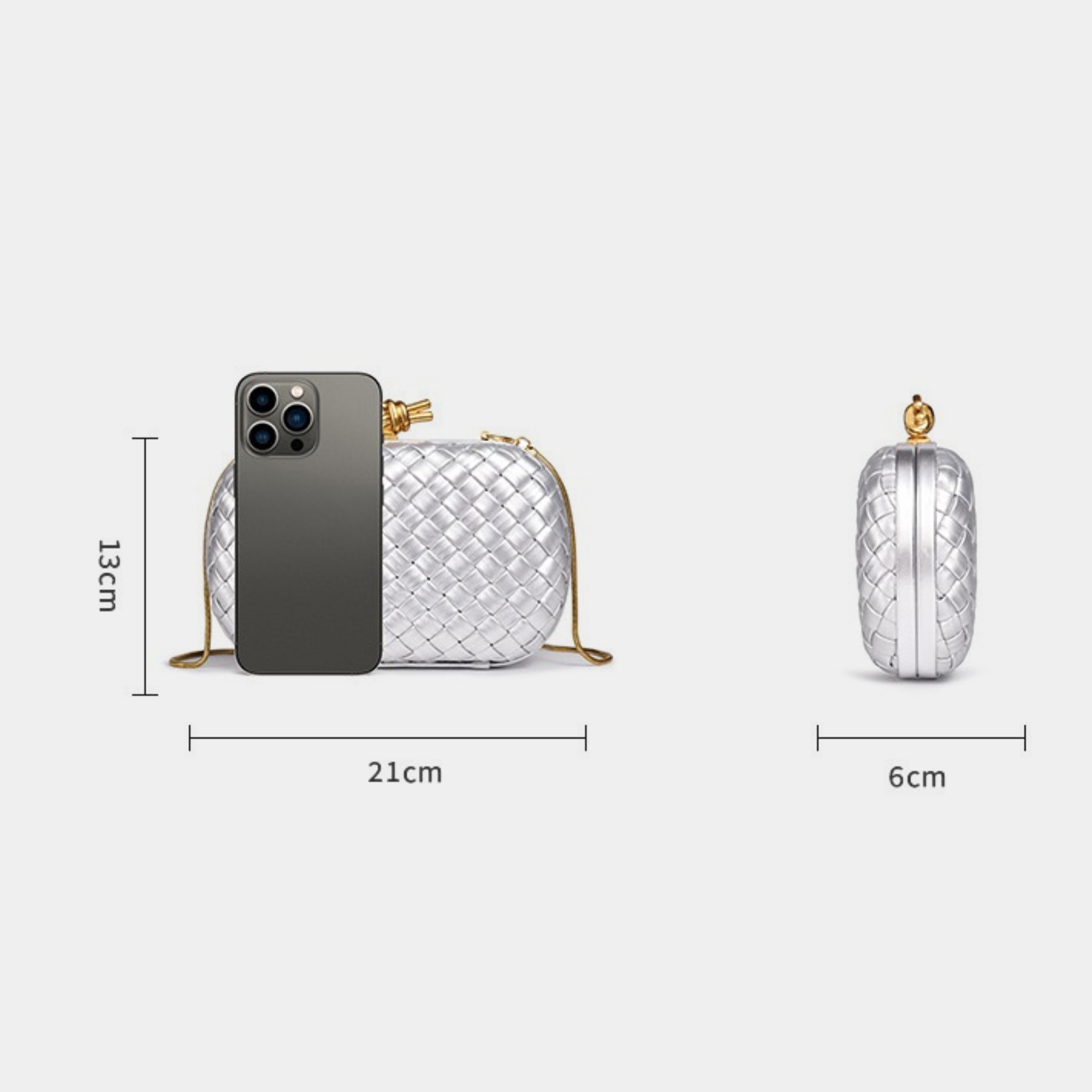 This woven leather clutch is a modern statement of elegance and style. Handcrafted with a sleek texture and finished with a gold knot clasp, it combines contemporary design with a touch of glamour. The structured oval shape opens to a smooth, lined interior that fits your phone, cards, and other small essentials. A detachable gold chain strap allows you to wear it as a clutch or crossbody, making it perfect for evening events, parties, or formal occasions.