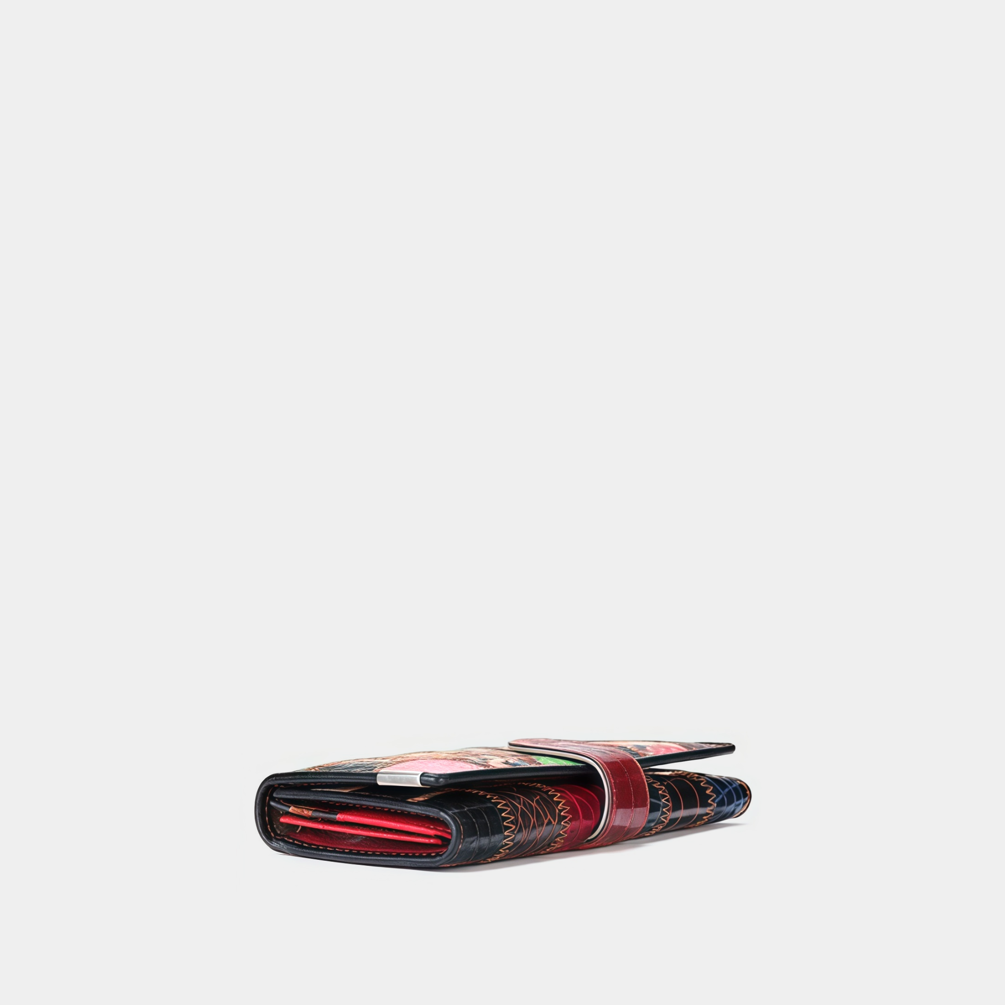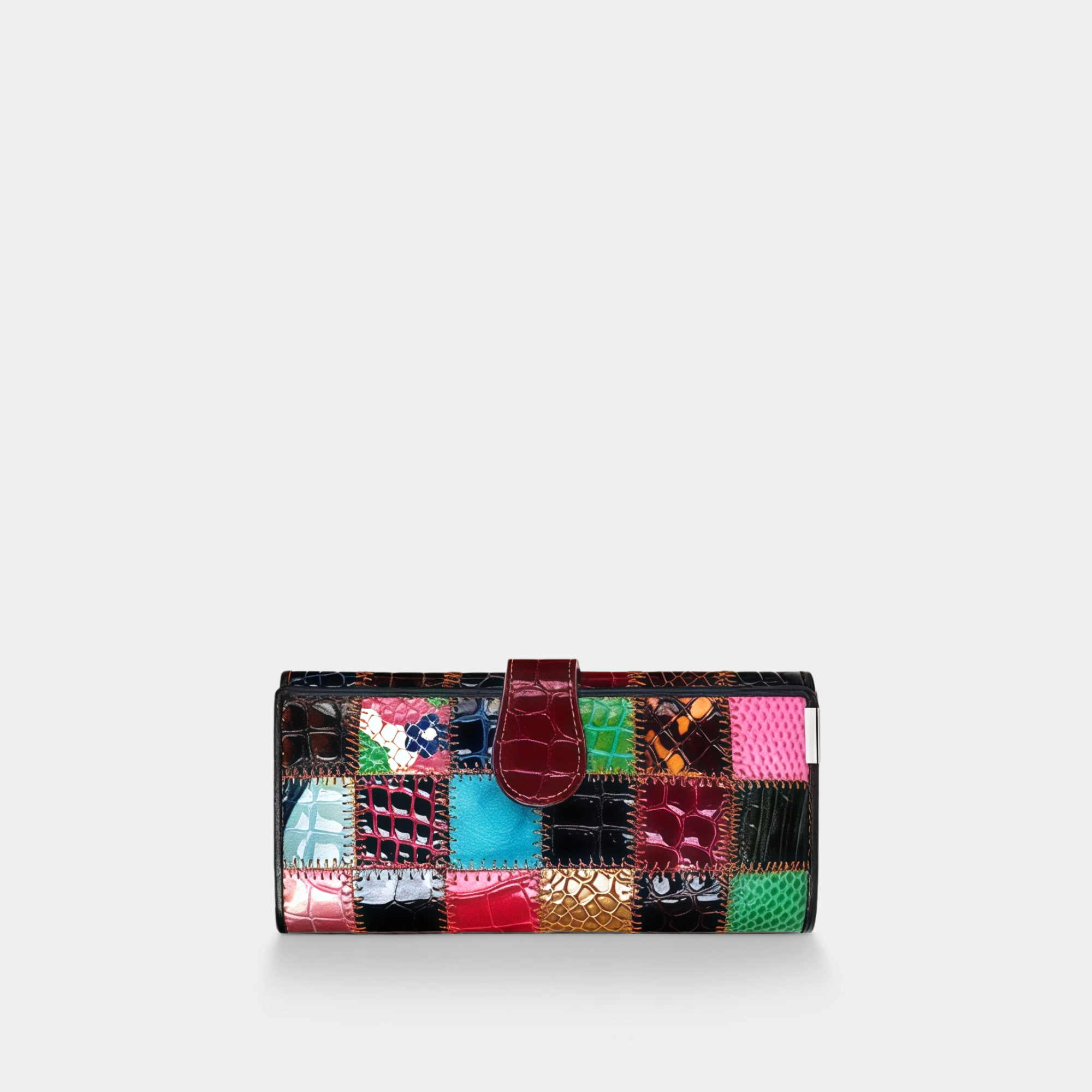 Handcrafted from top-grain cowhide leather, this wallet brings together vibrant artistry and fine craftsmanship. Each piece features a unique mosaic of embossed textures and rich colors, finished with a glossy sheen and precise stitching. The interior offers ample space with multiple compartments, perfect for daily organization. A secure snap closure ensures convenience and elegance, while the eye-catching patchwork design makes every wallet one-of-a-kind.