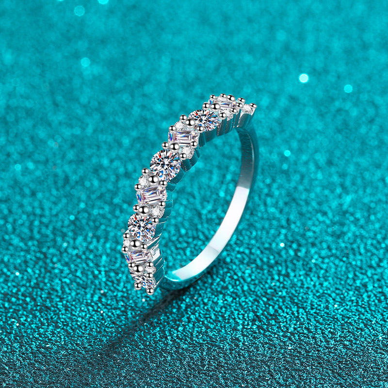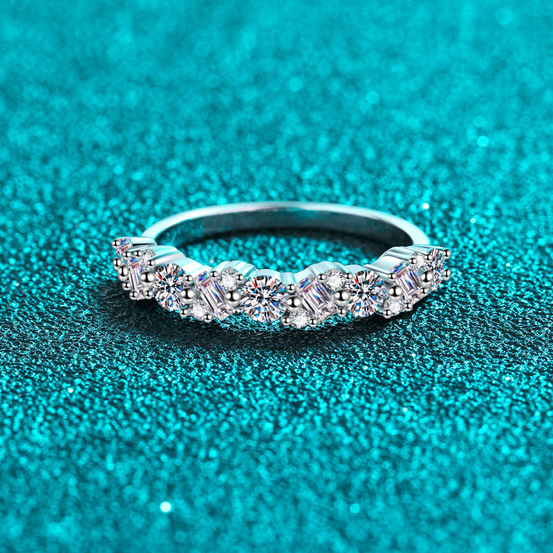 • Dimensions: 0.9 ct, Color D, VVS1 Moissanite, US size 4 1/2 - 9 available