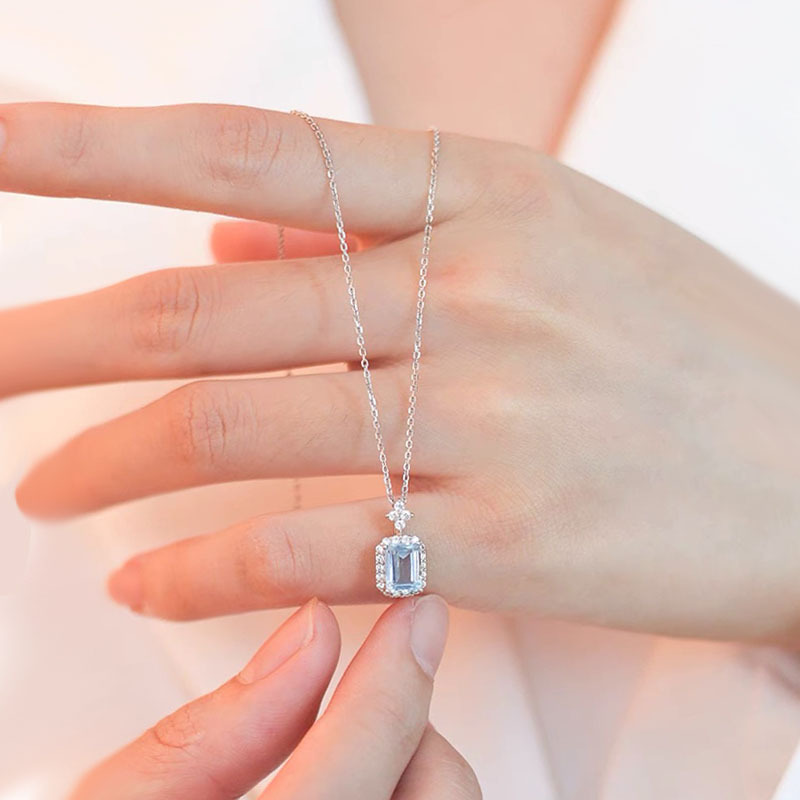 Emerald Cut Blue Topaz Halo Charm Necklace