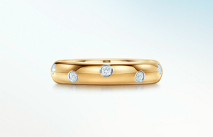 In a burnish setting, stones are nestled in hollows within the band and secured in place by burnishing, or pressing, the metal to cover each gem’s girdle. This setting protects each gemstone by positioning it at or below the metal’s surface.