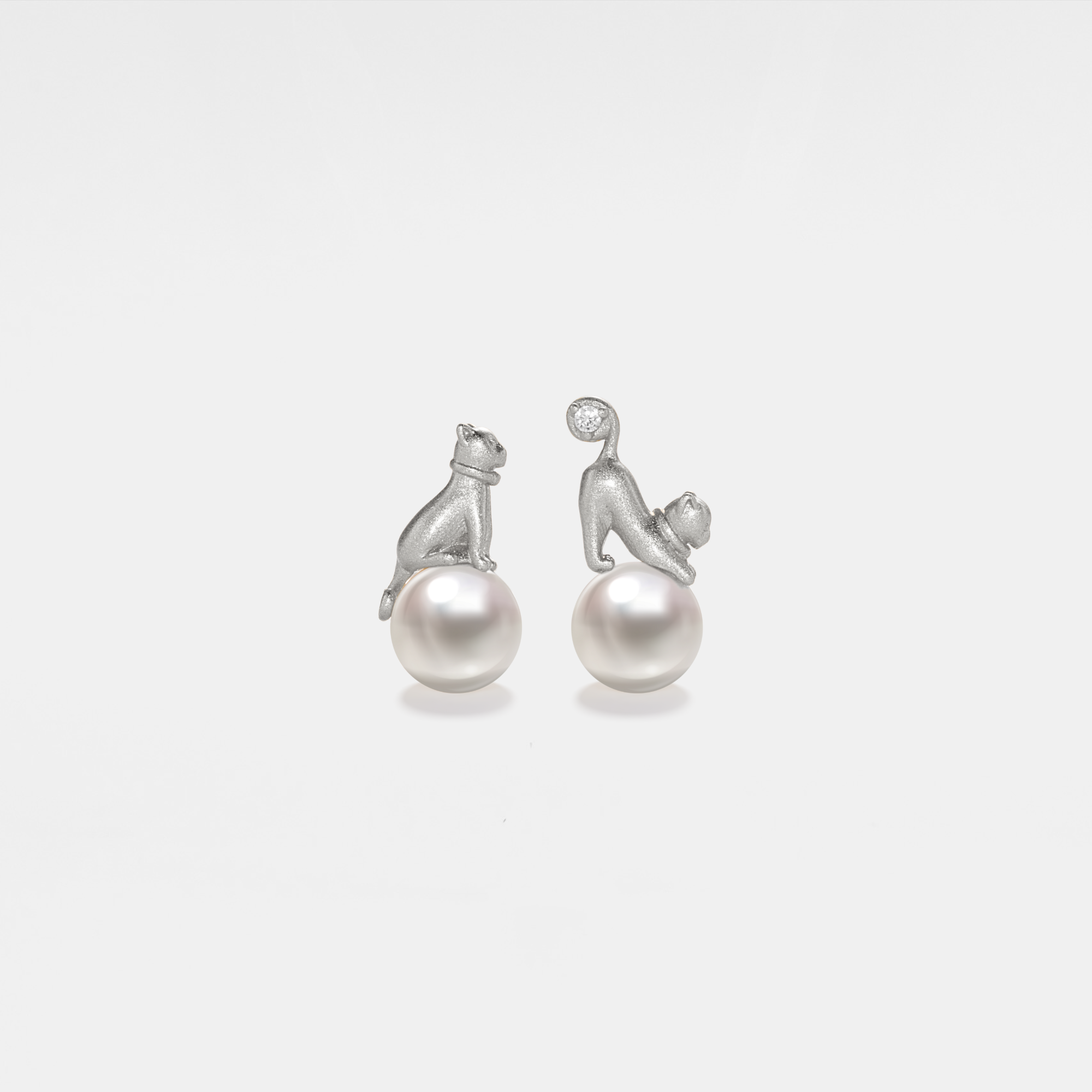 Small Gold Cat Pearl Mismatch Stud Earrings