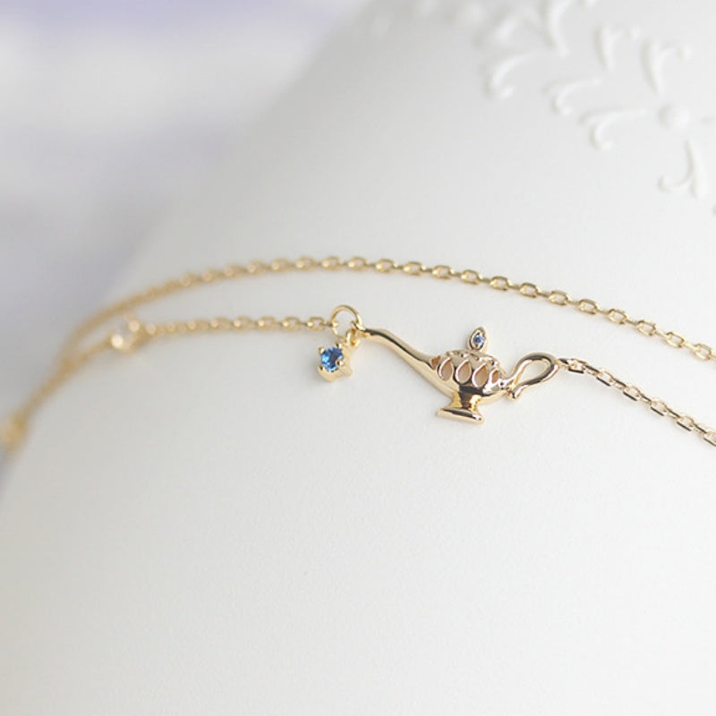 Inspired by timeless tales, this delicate gold bracelet with a genie lamp charm and shimmering stone brings storybook magic to your style.