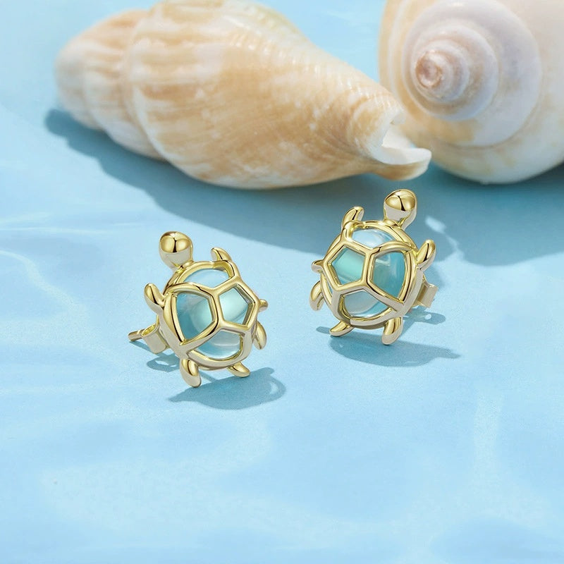These turtle stud earrings feature a smooth aqua-toned stone set within a polished gold frame, creating a soft contrast between color and shine. The delicate turtle silhouette adds a playful yet refined touch, making them perfect for everyday wear or as a meaningful gift.
