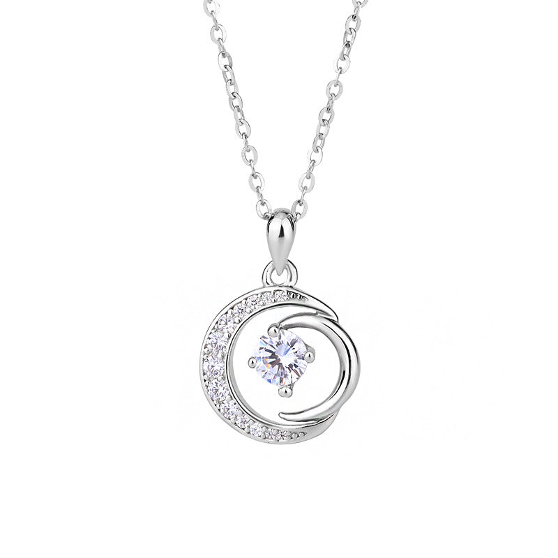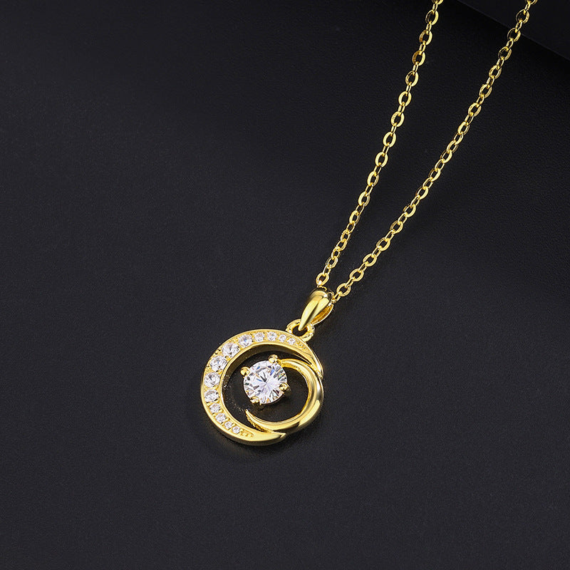 This Twin Moons pendant necklace features interlocking moon motifs, a floating central crystal, and shimmering accents. Strung on a delicate chain, it blends celestial charm with subtle elegance—ideal for daily wear or adding a dreamy touch to any outfit.