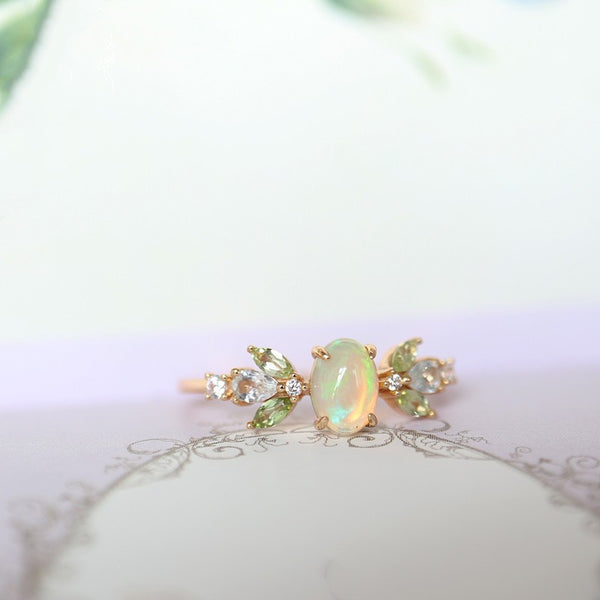 Gold Oval Opal Cabochon Leaf Stacking Ring